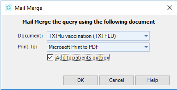 Select the outbox document that you have previously set up, a dummy printer (i.e Microsoft XPS Document Writer, CutePDF, OneNote or similar) and tick 'Add to patient outbox'. Then click OK. This will send the text messages - please note that your Medtech might not react for a few minutes while it processes the request.